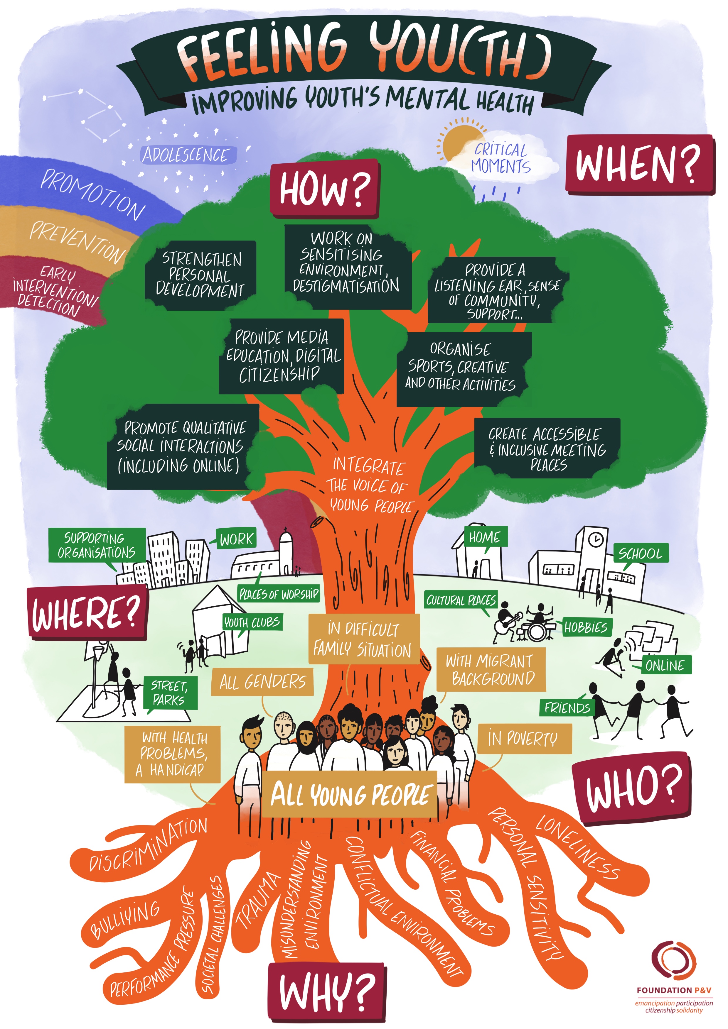 Discover the 16 winning project by theme! The themes are linked to our "Mental Health Tree" , developed by young people and researchers during a day of reflection on mental health. This tree served as the basis and framework for our call for projects.
